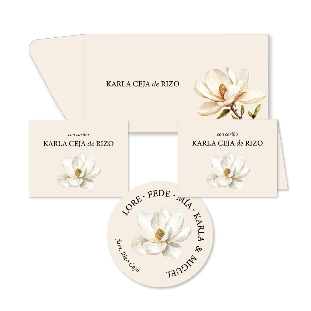 El set Magnolia combina tonos suaves con tipografía elegante, ideal para acompañar regalos, notas o correspondencia con un toque romántico y especial.