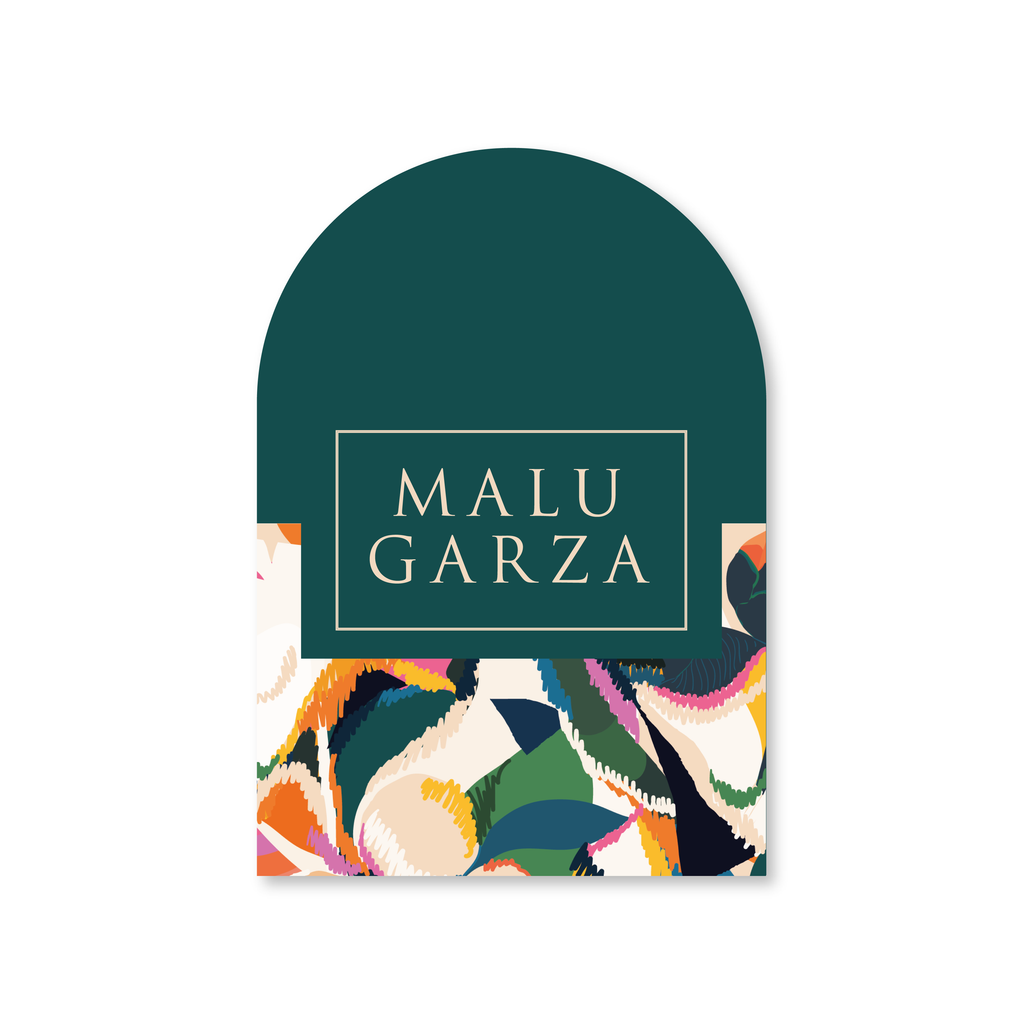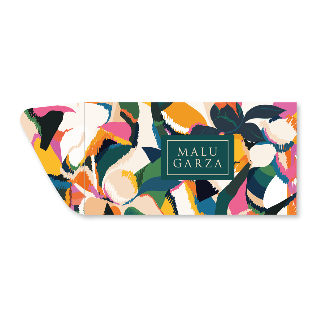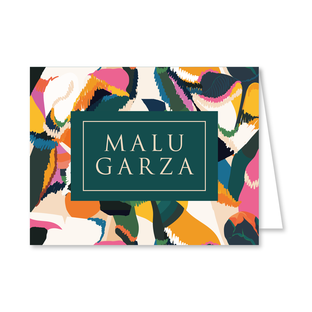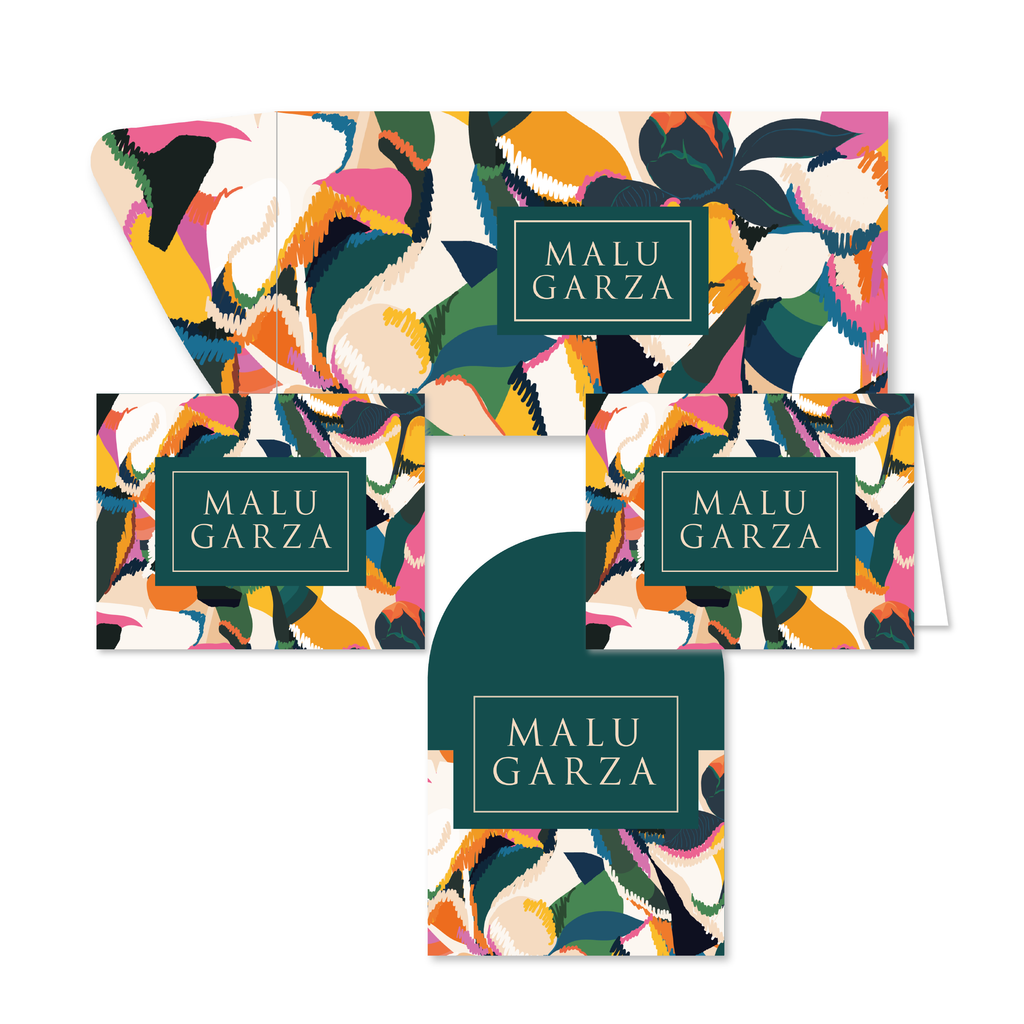 Cada set está elaborado en cartulina con un patrón pictórico abstracto en contraste con un elegante recuadro verde oscuro que enmarca el nombre, aportando sofisticación y un toque artístico.