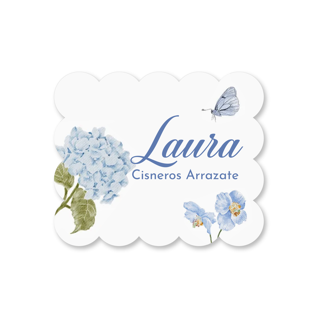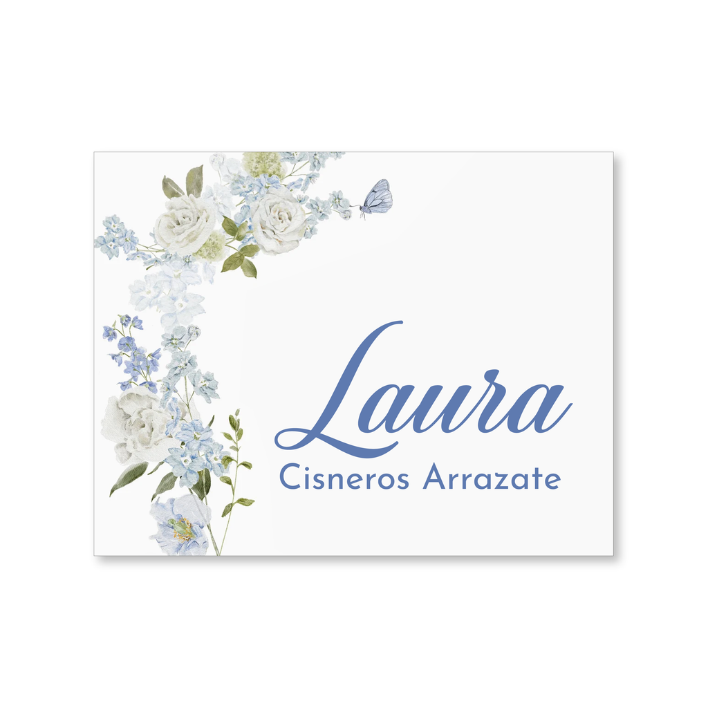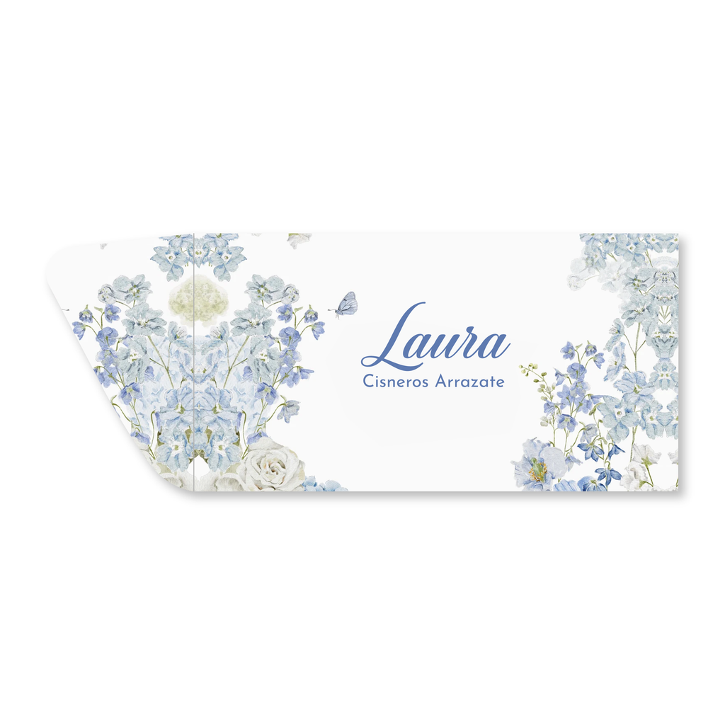 Cada set está elaborado en cartulina texturizada, con un diseño de flores pintadas en acuarela y una tipografía cursiva en azul que aporta frescura y un aire nostálgico.